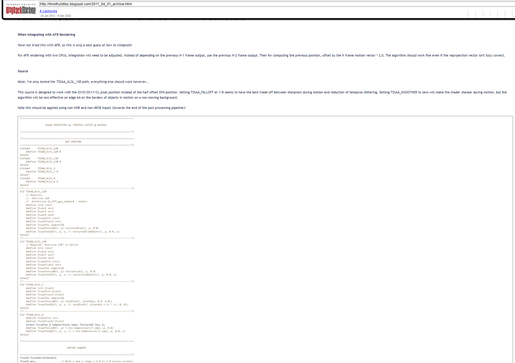 I've also already provided proof that Timothy Lottes, an NVIDIA employee at the time, was publishing about a form of TAA in 2011 (including code examples). Here's some screenshots of it since you don't seem to be reading the things I'm linking to (the timestamp says 20110403, which appears to mean April 3rd, 2011):