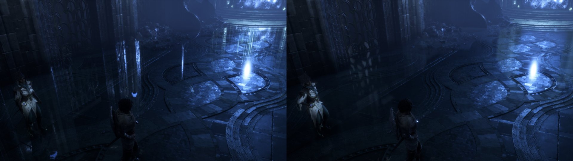 BioWare has used Ray Tracing to enhance the game’s reflections and ambient occlusion. So, in areas with lots of reflections, you’ll get more precise ones with no SSR artifacts. Moreover, thanks to RTAO, the game can look a bit better in shadowy areas. Below you can find two comparisons. The first highlights the RTAO, whereas the second shows the benefits of RT Reflections. The screenshots on the left are with RT and the screenshots on the right are without RT. The framerate is higher on the RT screenshot because we used DLSS 3 with FG on it.