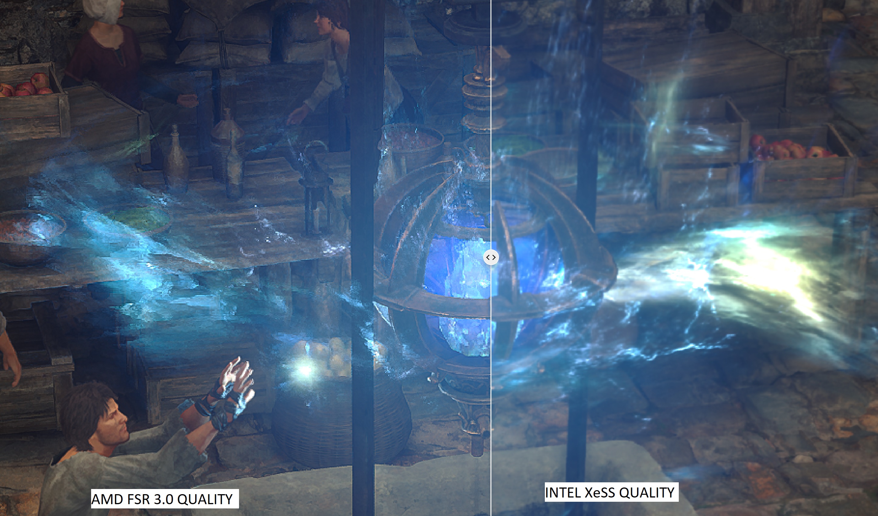 In this game, AMD FSR 3.0 suffers from major artifacts. While we did not notice major ghosting, almost all of the particles are a complete mess. Look how pixelated and “low-res” the whole scene looks with FSR 3.0 in the following comparison. Intel XeSS does not suffer from this issue. As you can see in the second comparison, Intel XeSS handles better the game’s particles.