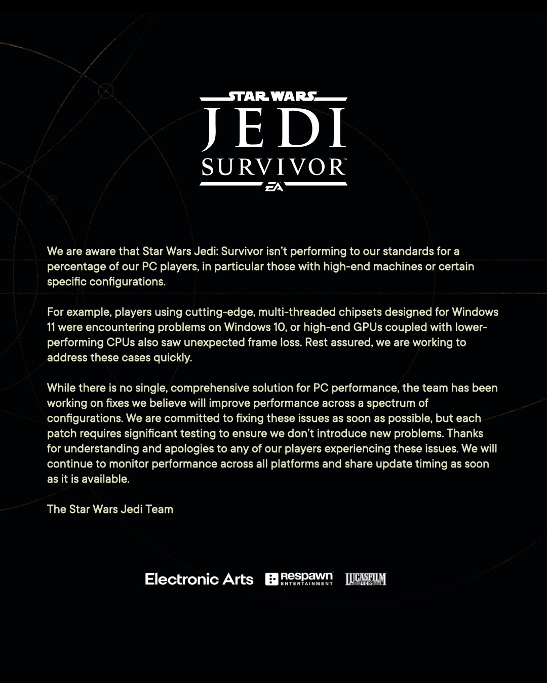 Most of the issues with Jedi Survivor seem to be related to high VRAM usage, so I expect that, much like TLoU on PC, cards with larger VRAM pools will generally perform better.