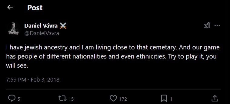 For those delusional enough to think it's a Christian game. It's a Jewish one full of subversion, with the same lies as always. Persecuted Jews who did nothing, yet magically got kicked out of over 100 countries for the same reasons thousands of miles apart by multiple ethnic backgrounds who didn't communicate with each other. Vavra also has attacked Christians as "destroying the culture" of his country. Maybe he would like to talk about the Crimean slave trade and who engaged in that. It was his people, not the people he pretends to be. That is what the Jewish culture helped bring to his country. Enslavement and trafficking it's children. Now they are the name who destroy the family unit with endless LBGTBBQ propaganda. They are the media like "Jon Stewart" who hides that Jews were just given minority status as financial aid with Trump also forming anti-semitism tasks force to protect them while they steal money as the richest religious demographic on the in the US.