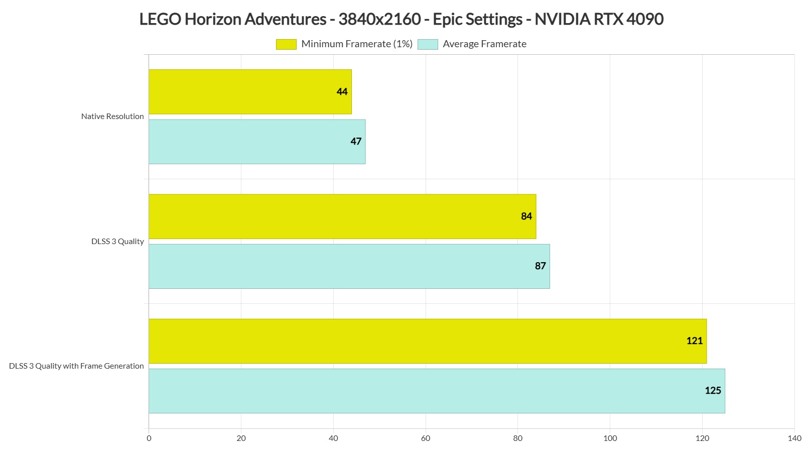 LEGO Horizon Adventures supports DLSS 3 Super Resolution and Frame Generation. However, there is no support for AMD FSR 3.0 or Intel XeSS. That’s a bummer for everyone who doesn’t own an RTX40 series GPU.