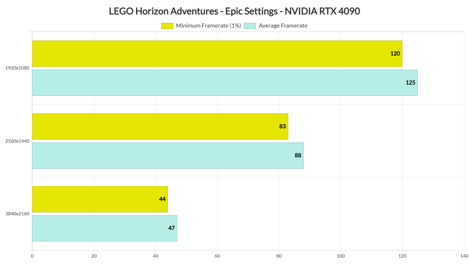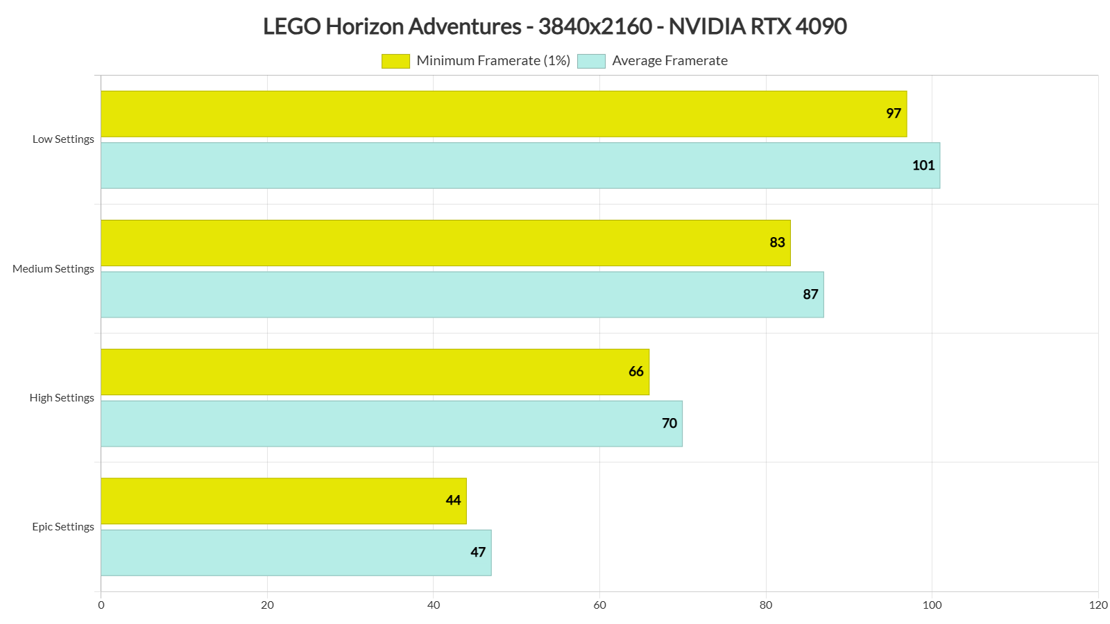 Now the good news here is that the in-game settings can significantly improve performance. By lowering the settings to High, we were able to get over 60FPS at all times, at Native 4K. We also saw noticeable performance improvements when we lowered our settings to Medium and Low. So, contrary to some early UE5 games, LEGO Horizon Adventures can scale down on older GPUs.
