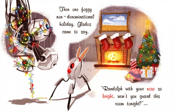 And then there is the a comic called “Randolph, the Red Nosed Turret” that was offered via the Valve Store. In page 3, we can see that the ‘Randolph’ turret is tasked to defend the Christmas tree. But take a closer look and notice that there are three stocking, three clouds in the painting – a painting that is similar with the end scene of Portal 2 – and three gifts under the Christmas tree. And all of them are in page 3. Well, that’s too much of a coincidence guys.