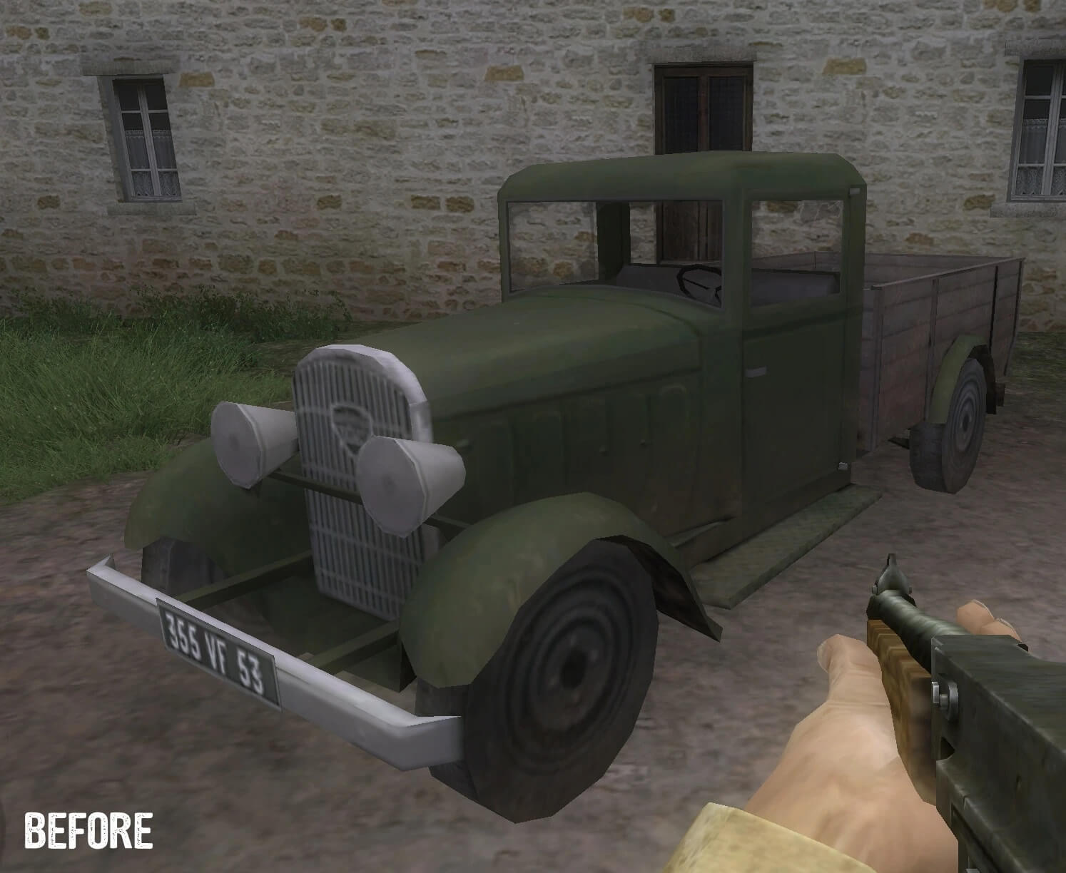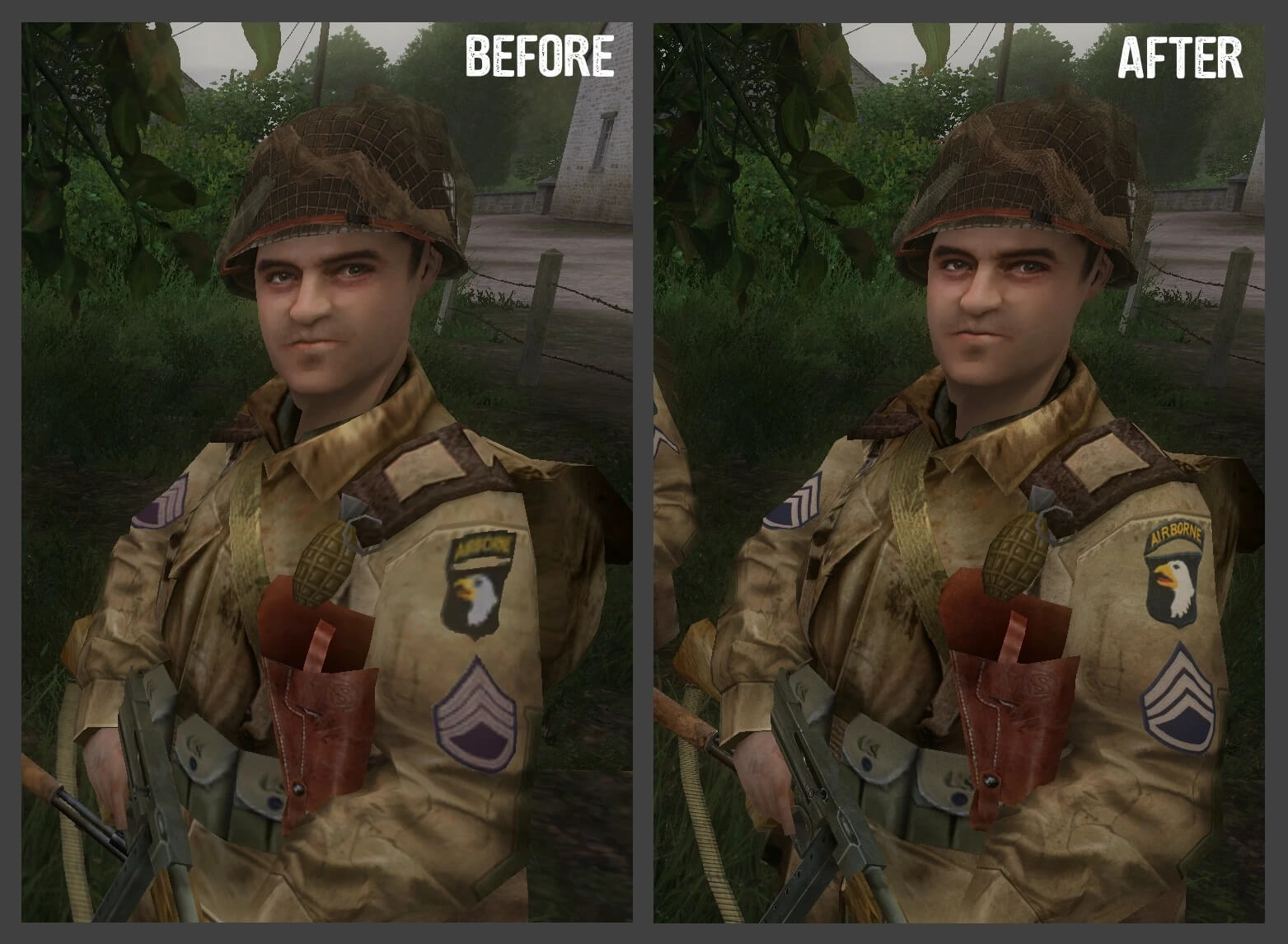 Going into slightly more details, this pack overhauls the textures for characters, weapons, vehicles, buildings, foliage and more. Basically, all textures have been overhauled. Not only that but the modder has remade from scratch the 101st airborne shoulder patches.