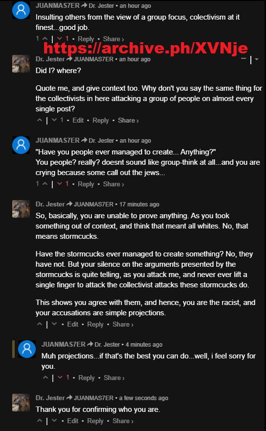 The stormcuck group. Your refusal to condemn or attack their collectivism and instead attacks me… Wait, I already explained this to you. Scroll up. Cope.