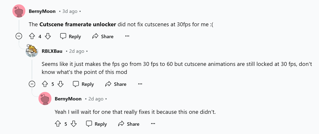 Do note that the mod will unlock the cutscenes, meaning that they will run with an unlocked framerate. So, if your GPU cannot handle the game with 60fps, you may also get choppy cutscenes.