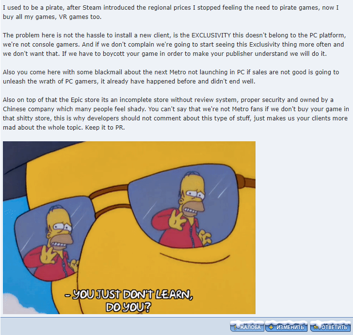 And it’s not PC gamers loss, it’s 4A’s! Can’t wait for the following title on DSOG : 4A Games gets closed due to poor Metro Exodus sales.