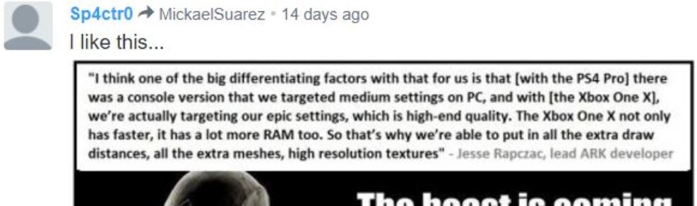 “On Xbox One X, ARK runs at 1440p 30 FPS, with settings approximately equivalent to “PC High””