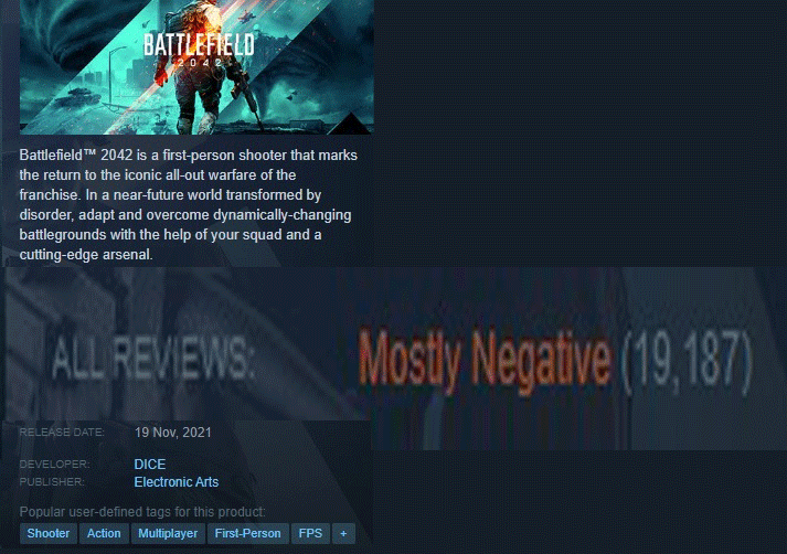 Electronic Arts and DICE released today Battlefield 2042 on Steam and in just a few hours, the game has received Mostly Negative Reviews.