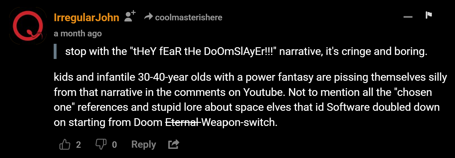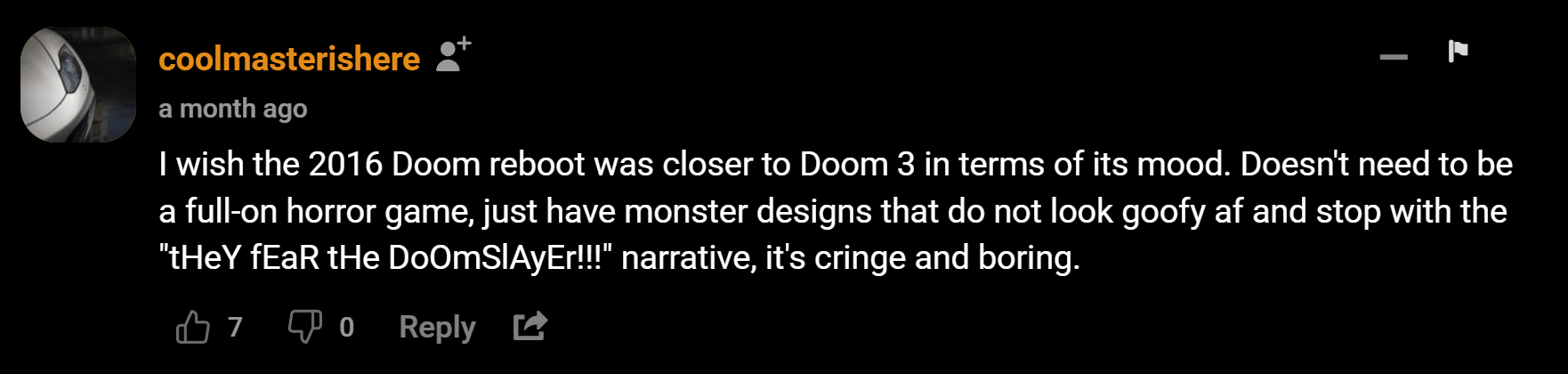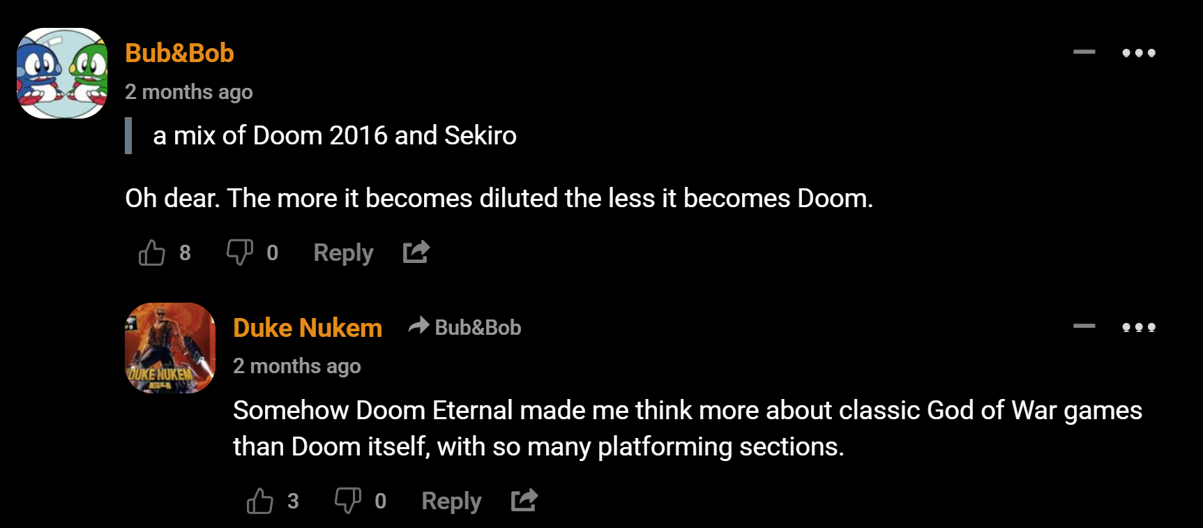 I actually liked the sci fi uac style of doom 2016, did not like the colorful heavy metal wow castles of eternal or the faux speedrunner combat, constantly switching guns. Somehow now doom is about being a medieval knight and riding dragons, wtf?
