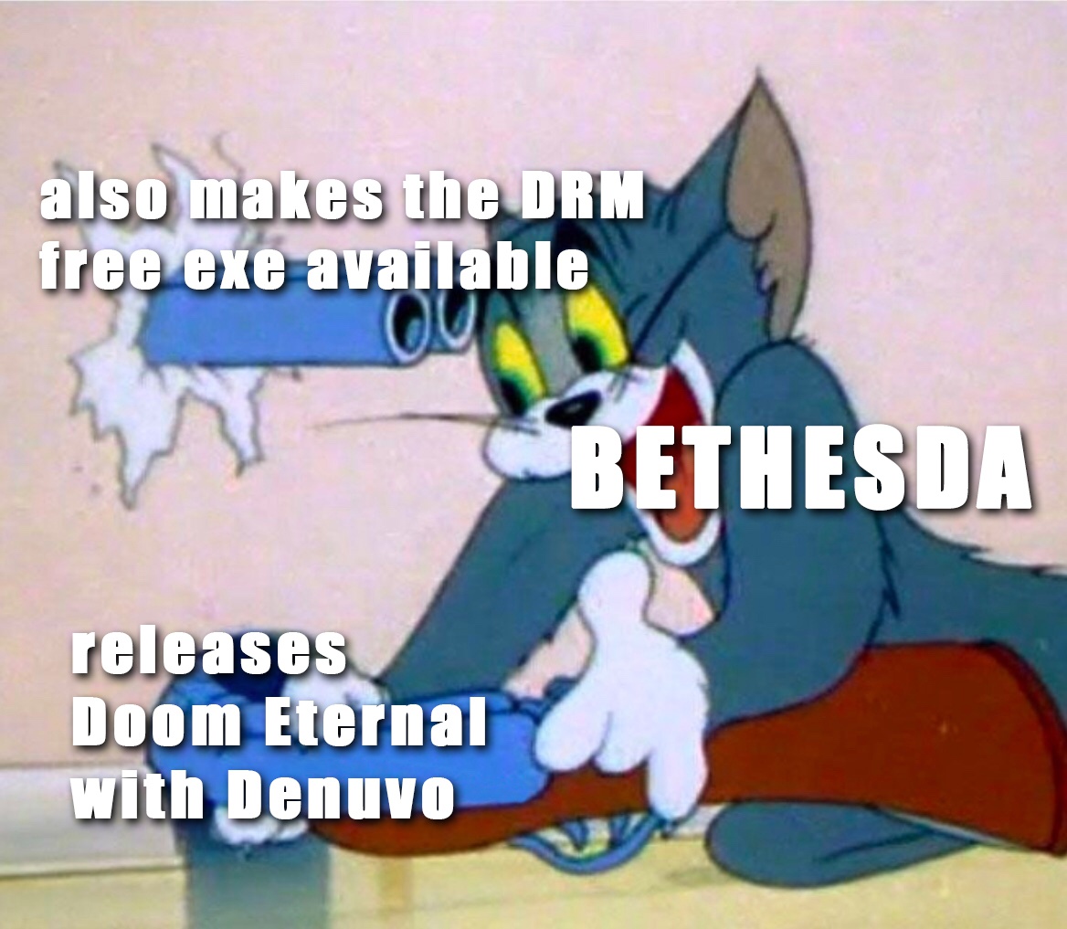 I remember Bethesda released DRM free on doom enteral launch https://uploads.disquscdn.com/images/b8d9878c3685f053a250f7e6670ae4d1fa278ad0aba02571aff647c0de367ece.jpg