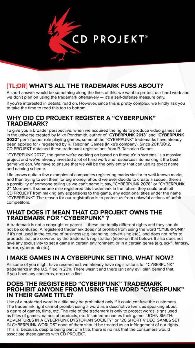 I don’t know even if you care Haz-Matt and Akirascreaming, but THEY DIDN’T TRADEMARKED CYBERPUNK WORD! Cyberpunk as in Cyberpunk 2020/2077 was already a roleplaying game, and they trademarked that game. NOT THE ENTIRE GENRE!