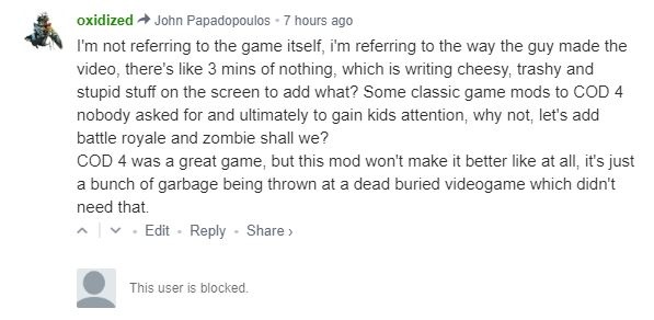 I’m not referring to the game itself, i’m referring to the way the guy made the video, there’s like 3 mins of nothing, which is writing cheesy, trashy and stupid stuff on the screen to add what? Some classic game mods to COD 4 nobody asked for and ultimately to gain kids attention, why not, let’s add battle royale and zombie shall we?