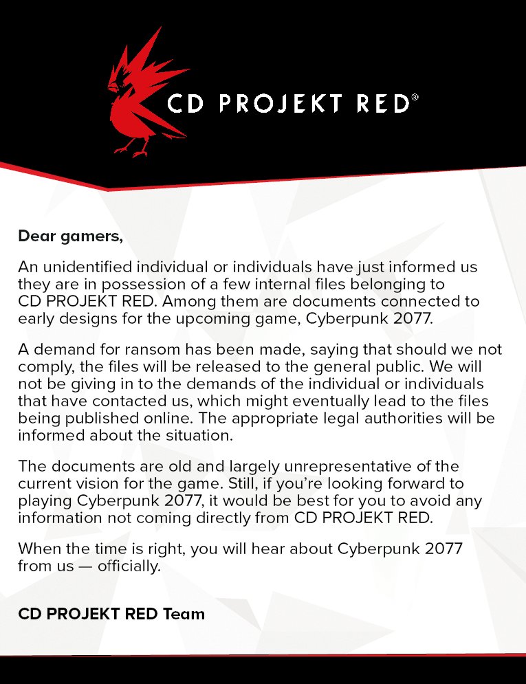 CD Projekt RED was crystal clear, stating that it will not comply and will not give in to such demands. As such, Cyberpunk 2077’s documents may be leaked in the coming days, weeks or months.