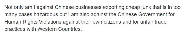 Not only am I against Chinese businesses exporting cheap junk that is in too many cases hazardous but I am also against the Chinese Government for Human Rights Violations against their own citizens and for unfair trade practices with Western Countries.