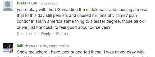youre okay with the US invading the middle east and causing a mess that to this day still persists and caused millions of victims? plan condor in south america same thing to a lesser degree. those all ok? or we just handpick to feel good about ourselves?