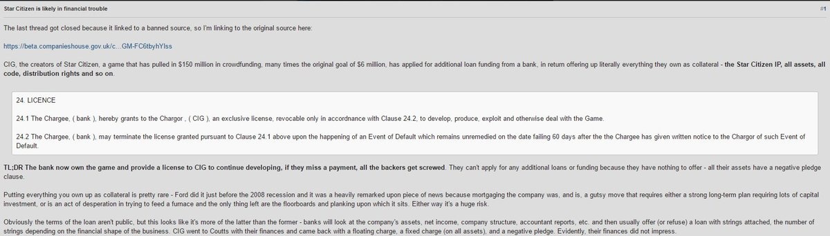 “The collateral granted in connection with this discounting loan is absolutely standard and pertains to our UK operation only, which develops Squadron 42. As a careful review of the security will show and contrary to some irresponsible and misleading reports, the collateral specifically excludes “Star Citizen.” The UK Government rebate entitlement, which is audited and certified by our outside auditors on a quarterly basis, is the prime collateral. Per standard procedure in banking, our UK companies of course stand behind the loan and guarantee repayment which, however, given the reliability of the discounted asset (a UK Government payment) is a formality and nothing else. This security does not affect our UK companies’ ownership and control of their assets. Obviously, the UK Government will not default on its rebate obligations which will be used for repayment, and even then the UK companies have ample assets to repay the loan, even in such an eventuality which is of course unthinkable.”