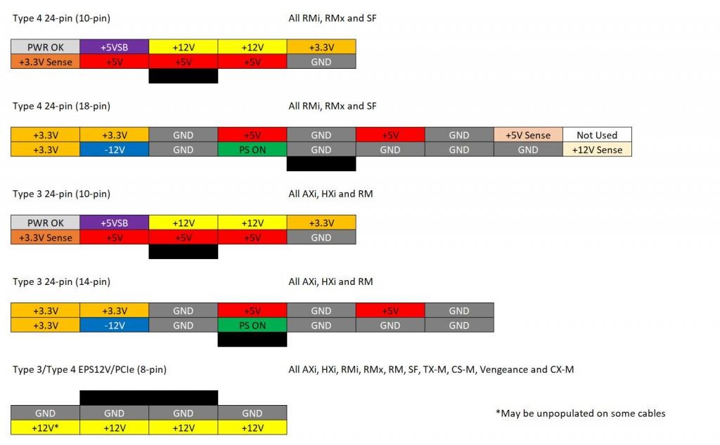 The Type 4 cables have the same pin-out as Type 3 cables, but include small, solid capacitors on the +12V, +5V and +3.3V leads on the 24-pin, PCIe and EPS12V cables.