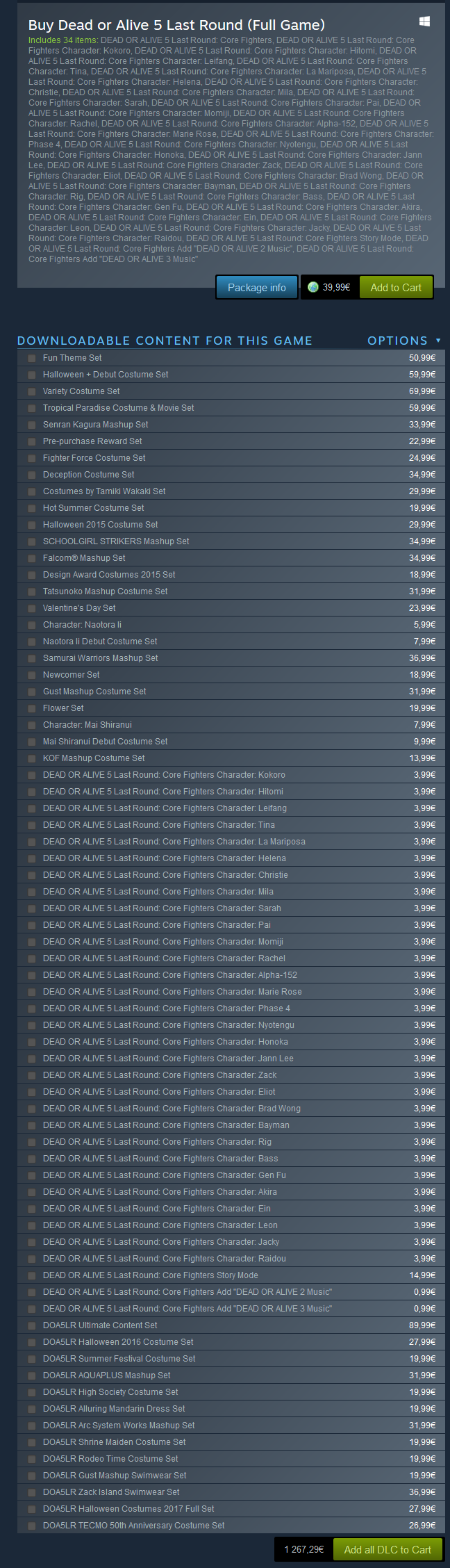 Dead or Alive 5: 71 DLC = 1267€