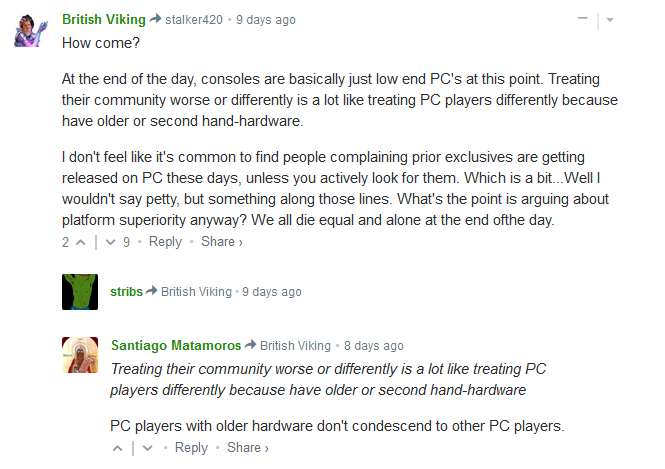 I don’t feel like it’s common to find people complaining prior exclusives are getting released on PC these days, unless you actively look for them. Which is a bit…Well I wouldn’t say petty, but something along those lines. What’s the point is arguing about platform superiority anyway? We all die equal and alone at the end ofthe day.