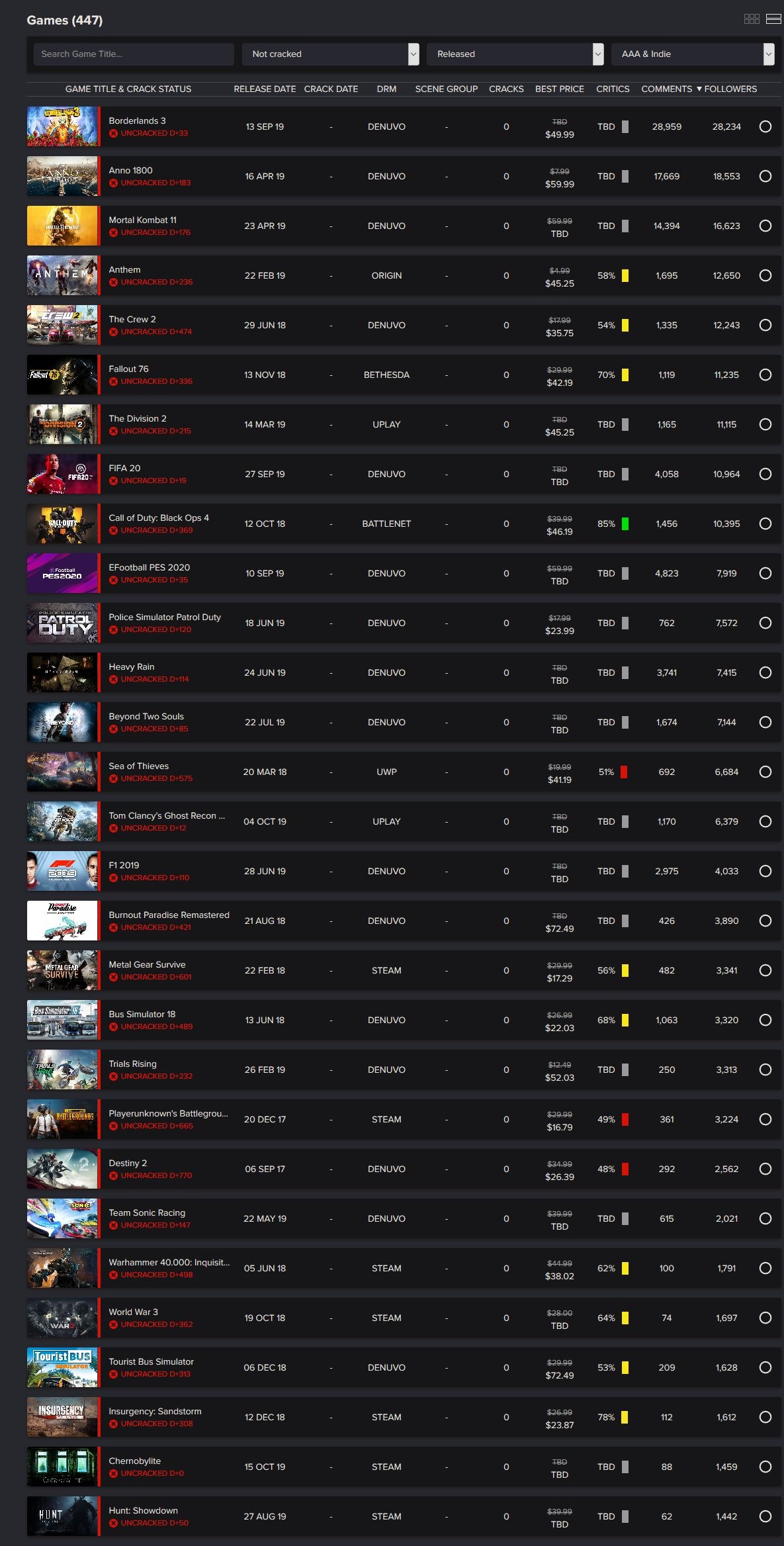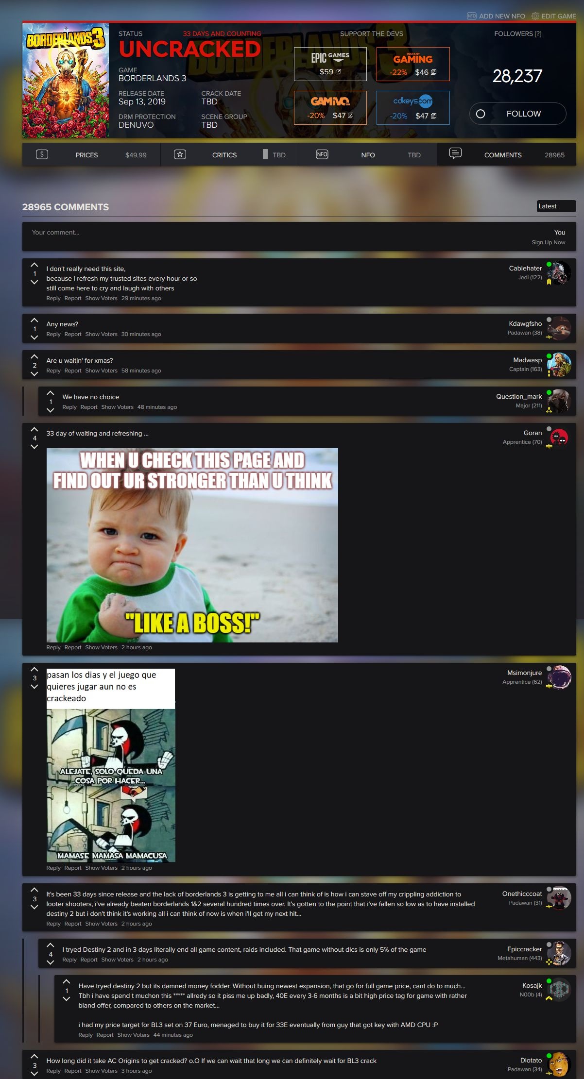 despite the problems of the game I assure you that there are thousands of people who go on or spend the day pressing f5 on the pirate sites, waiting to see Borderlands 3 cracked … is a game that has a lot of demand and if it has not yet been cracked is ONLY because it is more difficult to do it because it has a version of Denuvo not yet bypassed.period.