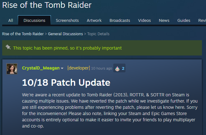 More important for me is, that they actually patched all 3 Tomb Raider games (including TR 2013, all in one day!) to include Epic Online Services. Some players are already having a lot of problems with this service, it seems to