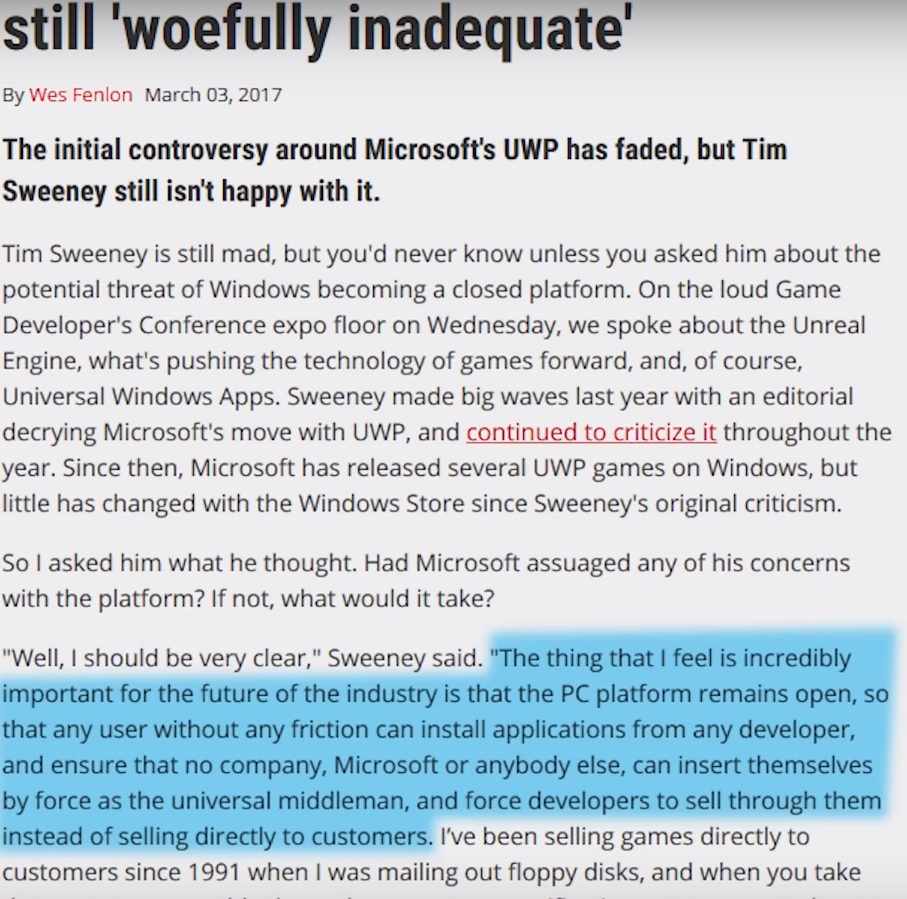 1. What he means by open is to not make a platform exclusive to just one OS, in this case Windows 10. Epic is still better than UWP.