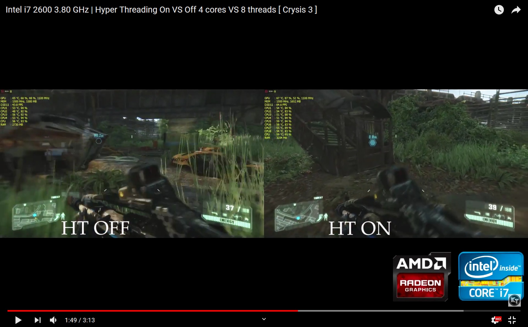20 fps difference with 64 fps with HT on, and 43 with HT off (the same CPU i7 2600). And keep in mind CPU usage is lower than expected, so maybe with better GPU performance difference would be even bigger.