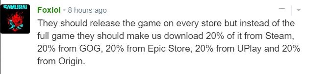 They should release the game on every store but instead of the full game they should make us download 20% of it from Steam, 20% from GOG, 20% from Epic Store, 20% from UPlay and 20% from Origin.