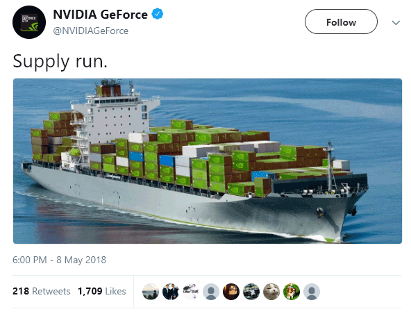 On a side note, NVIDIA also made a tweet earlier. New stock of GPUs are inbound, and it seems supply is also on the rise, hopefully after the slight decline in mining craze.