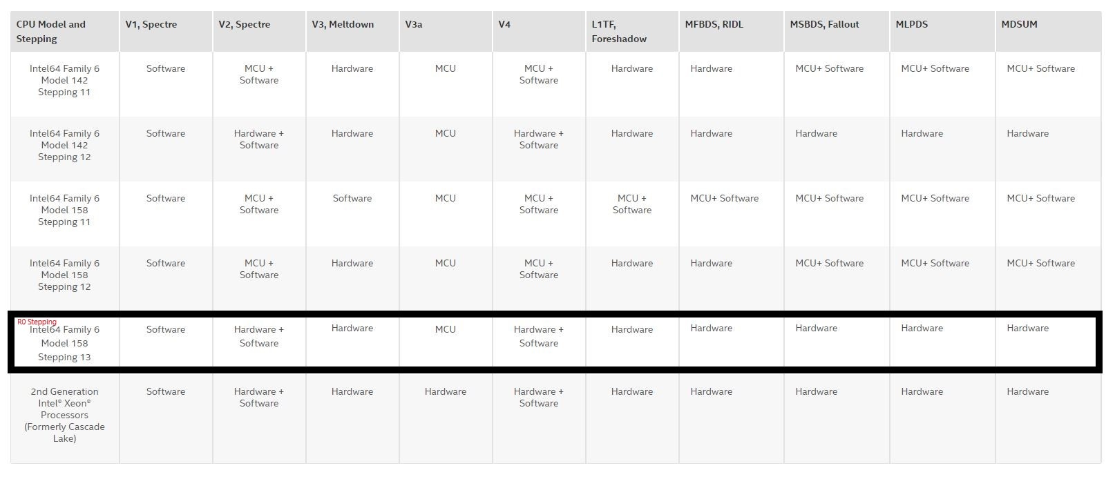 One thing I forgot to mention is that Intel has added new hardware-level mitigations for many of the new vulnerabilities, like MSBDS, Fallout, Meltdown etc, with new steppings on it’s die.
