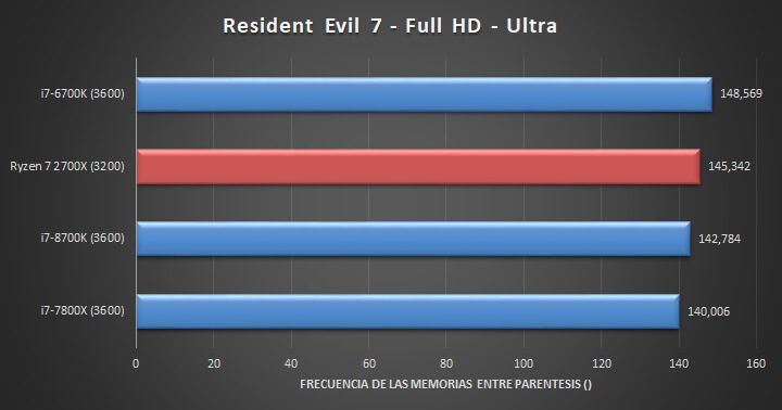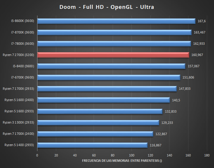 What’s really interesting here is that at 1080p, the AMD Ryzen 7 2700X was able to come really close to the Intel i7 8700K. While AMD claimed that the Ryzen 7 2700X CPU would be around 7.7% slower in a variety of games than the i7 8700K, El Chapuzas Informatico claims that AMD’s new CPU is faster in Battlefield 1, Total War Warhammer 2 and Resident Evil 7 than the i7 8700K. On the other hand, Rise of the Tomb Raider appears to be GPU-limited even at 1080p and DOOM appears to be running better on the i7 8700K by 2%.
