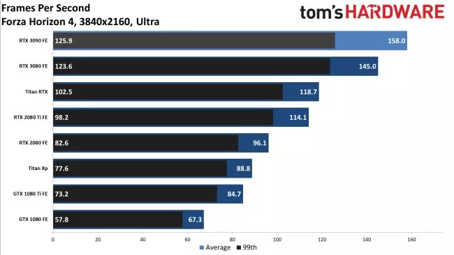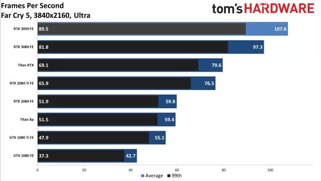 Tomshardware states that the RTX3090 can run Red Dead Redemption 2 in 4K/Ultra with 83fps. According to its data, the RTX3090 is 7fps faster than the RTX3080, and 16fps faster than the RTX2080Ti. This latest GPU can also run in 4K/Ultra Far Cry 5 and Forza Horizon 4 with more than 100fps.