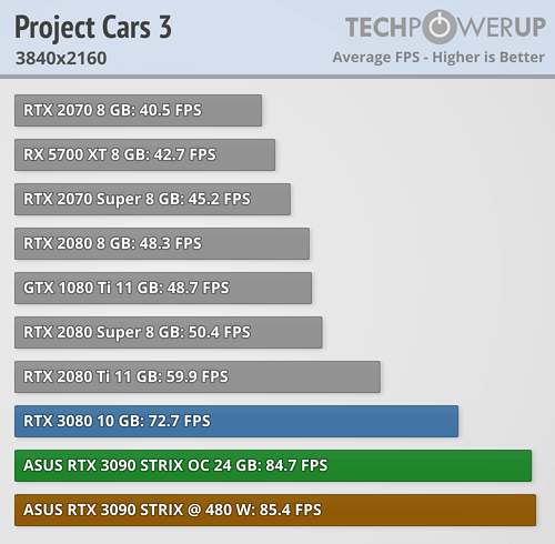 TechPowerUp has tested a custom RTX3090 model, the ASUS GeForce RTX 3090 STRIX OC. As TechPowerUp noted, this GPU can run Project CARS 3 with 85fps in 4K/Ultra. Star Wars Jedi: Fallen Order can also run with more than 90fps in 4K.
