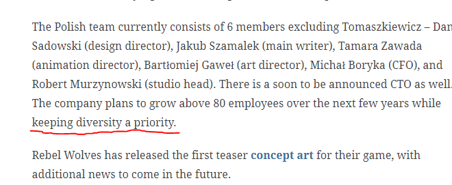 Well I can only wish them all the best as The Witcher (2007) and a lot of elements of Witcher 3 (music, direction) I enjoy quite a lot. Hopefully their game won’t be plagued by the trendy agenda and Konrad and Co will finally deliver a worthy cRPG.