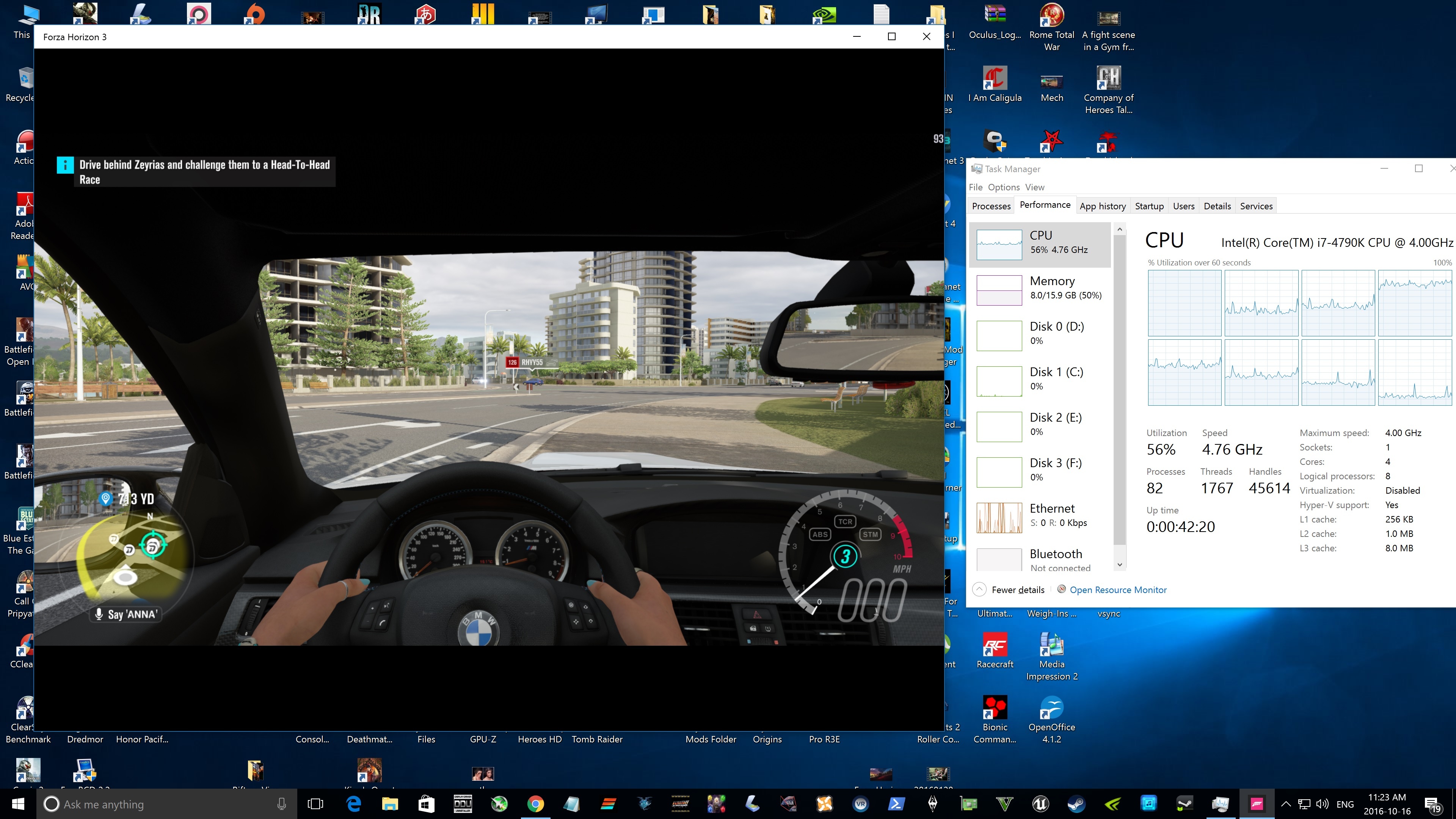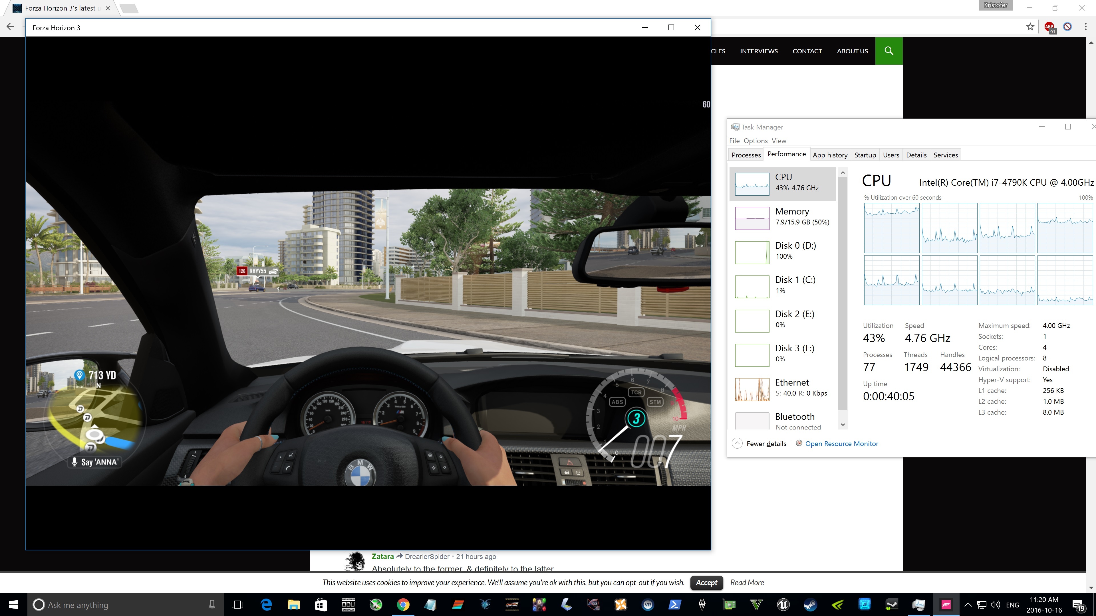 Playground co-developed FH with Turn 10. It is a collaboration of sorts. Turn 10’s assets and physics systems with an open world designed by Playground. An my point is that as far as driving games go (both Sim and Open-World/Simcade) the engine that Forza is built on is top shelf. On my system I can run the game in EVERY area of the map in 4K locked to 60fps (with minor dips to 58fps every now and then. Turning off vsync COMPLETELY eliminates that as the game runs north of 70fps at all times…) and with Ultra setting (optimization turned of) and with 2xMSAA. Plus my first core, while running higher then the rest, NEVER hits 100%. And that is on a i74790k running at 4.7GHz. Hyper-Threading on. And truth time here… I run a single Pascal Titan X. But this gripe seems to be about CPU bottlenecks (which don’t exist for me…) not GPU bottlenecks. And I am here saying I don’t see the issue. Maybe if John had more then ONE system to run these tests on his results would be more legitimate. I have 3 gaming PC’s at home (only two with Windows 10 though…) So on both of those systems I haven’t had issues with FH3. My other system (that runs Win10, so I can try FH3 on it…) also has no issues. That system I run the game at 1080p/60fps or 1620p/30fps both on Ultra. It has a i72600K@4.8GHz and a GTX980. Anyway, what other driving games that offer EVERYTHING that FH3 does can you think of that runs better? Then answer is NONE. Because there are NONE. And in my experience the game runs flawlessly (Except for FFB with my Fanatec CSWv2 is WEAK!!! Haven’t test it after this latest patch though, So my fingers are crossed!), and that is the opinion of many other media outlets as well (although I am using my personal experience here…). So there. You said “”Excellent” in what way, exactly? It can’t retain a stable 60 FPS, it doesn’t seem to have proper support for multi-cores, in 2016, even with DX12, etc.” And I am saying that you are getting only one persons impression (that being Johns) to base you negative opinion on. Maybe look a little further before you cast your opinion about something. Not one guys, who only has one computer.