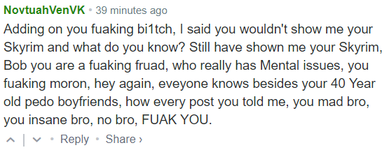 Adding on you fuaking bi1tch, I said you wouldn’t show me your Skyrim and what do you know? Still have shown me your Skyrim, Bob you are a fuaking fruad, who really has Mental issues, you fuaking moron, hey again, eveyone knows besides your 40 Year old pedo boyfriends, how every post you told me, you mad bro, you insane bro, no bro, FUAK YOU.