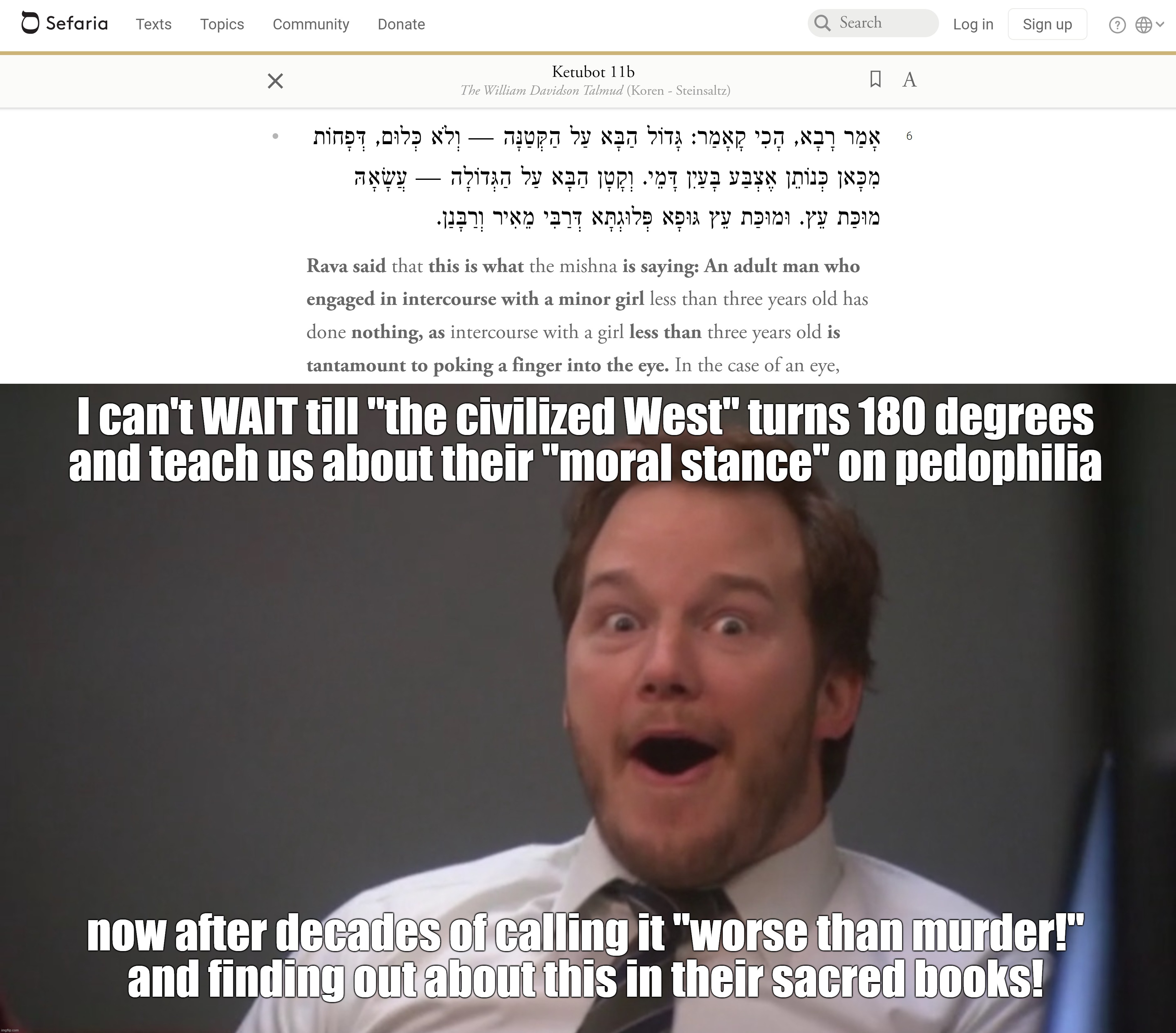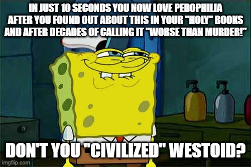 I bet some “civilized” Westoid is gonna redefine pedophilia and add an exclusive age for 3-year-olds as “consenting” but “not consenting” until 18-year-old now after finding out about this in their sacred books!