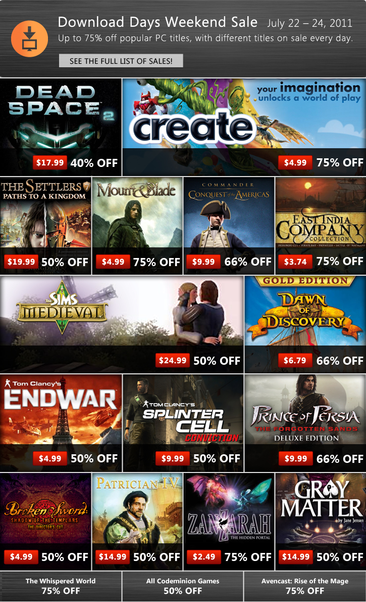 Impulse’s special download weekend is a go and PC gamers can find a lot of great games at really low prices. Dead Space 2 is priced at $17.99 with a 40% discount, while Splinter Cell: Conviction is priced at $9.99 with a 50% discount. Adventure fans will be able to purchase Gray Matter at $14.99 and The Whispered World at $7.49.