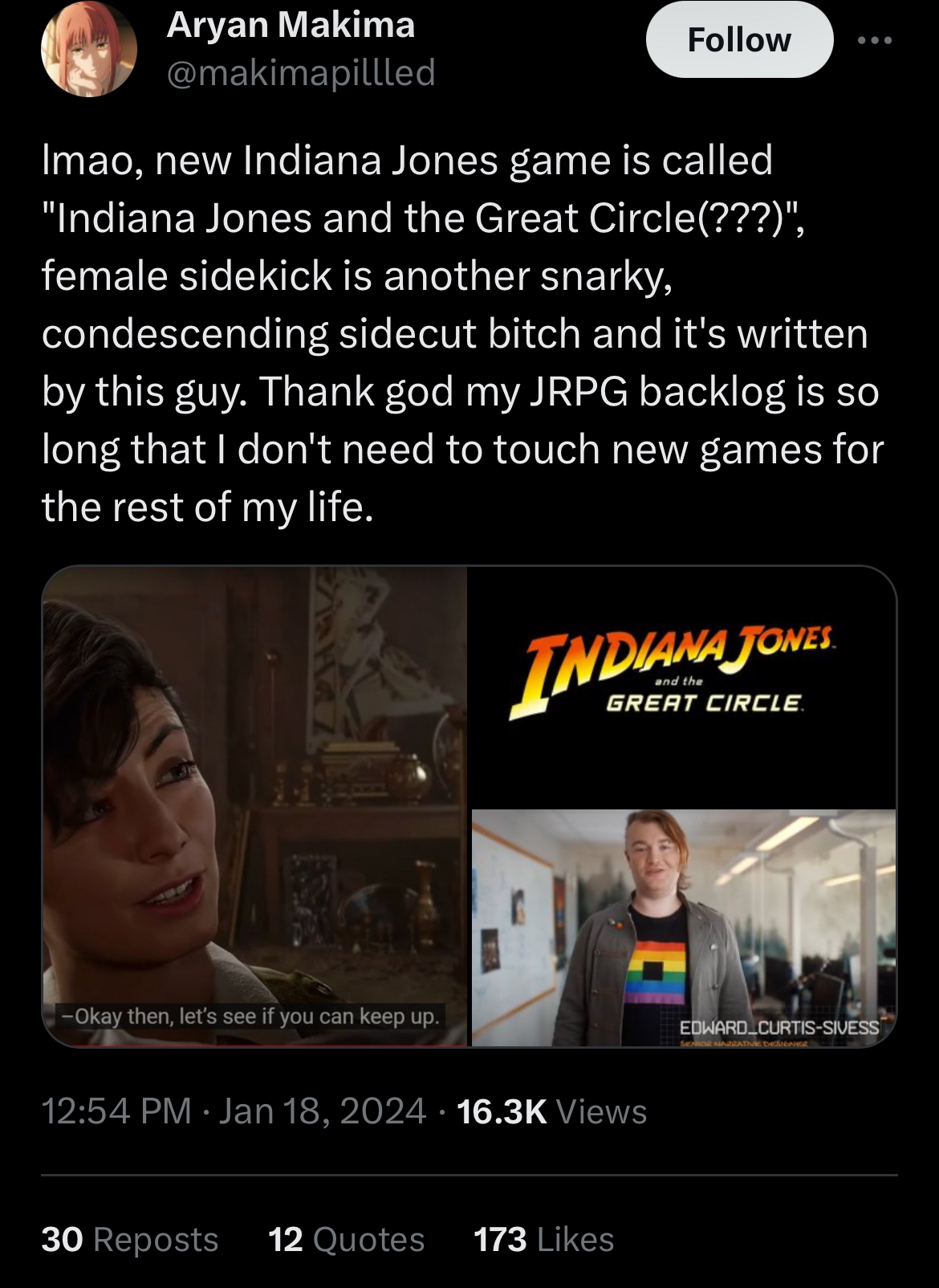 The games Director made Wolfenstein:Youngblood. A game so bad it has a 2.5/10 Metacritic rating from users. The games writer looks like he is transitioning and created a self insert character with the "girl", who the studio has called the co-protagonist. The last Indiana Jones movie lost between 200-300 million depending on advertising pushing the same kind of co-protagonist. If you preorder this or buy it you have an IQ lower than room temp in an igloo. https://uploads.disquscdn.com/images/996b6c1248511c1d4764a8e8cdc80b73085e28b3350a01eec88a54e9af0da5f4.png