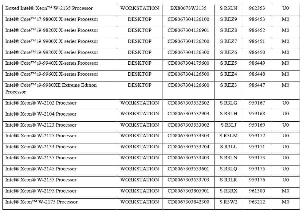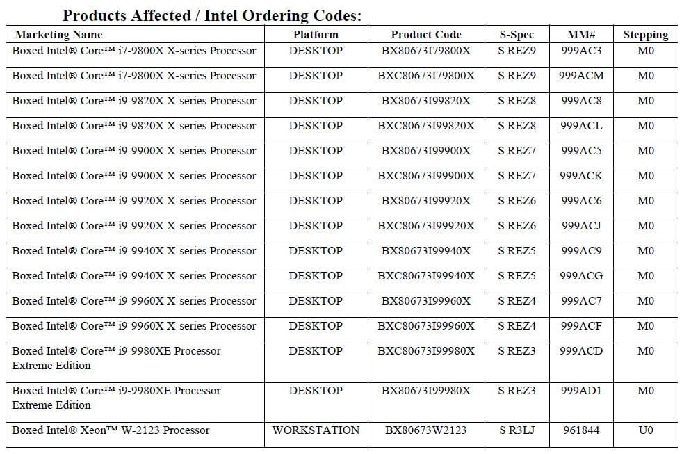 The new PCN covers the entire 9th-Gen Core-X chips including the big Core i9-9980XE. These include the boxed and tray versions of the i7-9800X, i9-9820X, i9-9900X, i9-9920X, i9-9940X, i9-9960X, i9-9980XE, and the Xeon W-2102, W-2104, W-2123, W-2125, W-2133, W-2135, W-2145, W-2155, W-2195 chips.