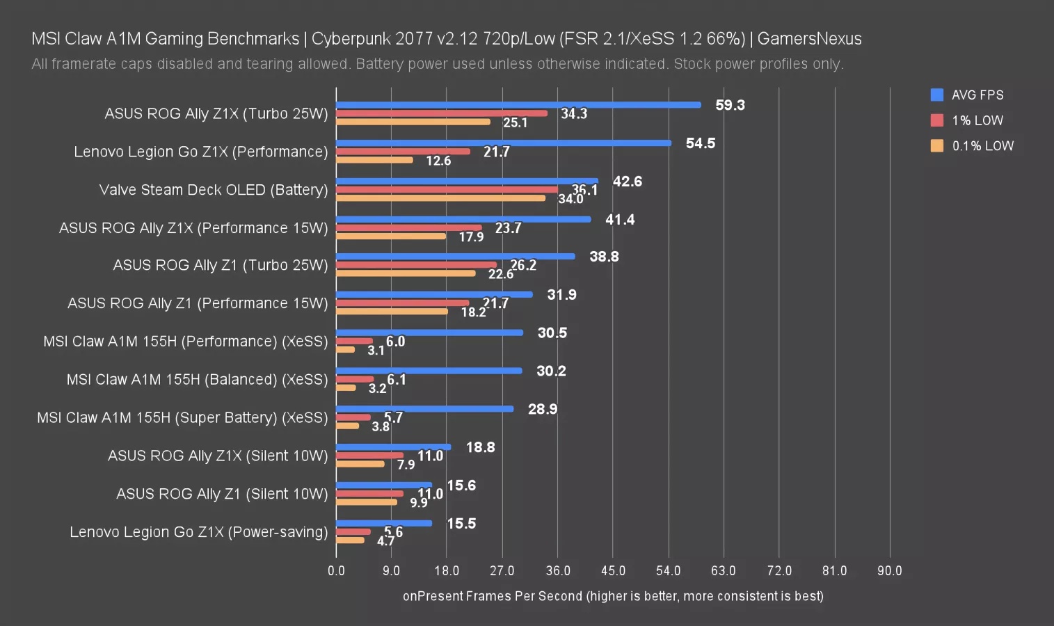 Just look at those 1% & 0.1% framerates of the MSI Claw, which is powered by Intel’s latest & greatest “Core Ultra” chips, against the Steam Deck using an old-gen AMD APU (Zen2 + RDNA2):