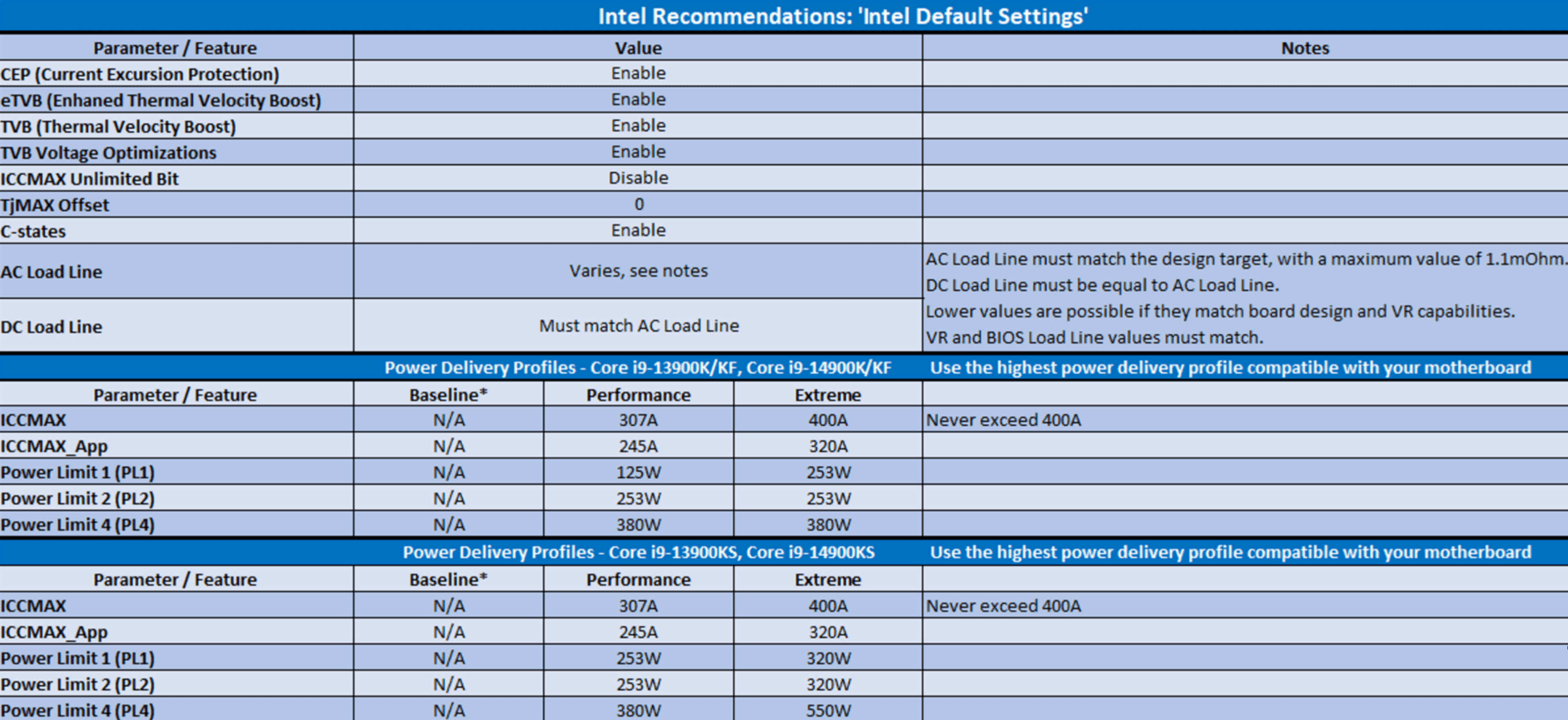 These ‘Intel Baseline Profile’ BIOS settings appear to be based on power delivery guidance previously provided by Intel to manufacturers describing the various power delivery options for 13th and 14th Generation K SKU processors based on motherboard capabilities.