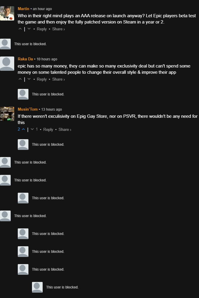 It’s surely a bad state for the site, that it’s reached this point where those of us who have been with the site for years, have had to block so many asshats that have only just come to this site in recent years, just to spew fanboyish crap (like EGS defenders).