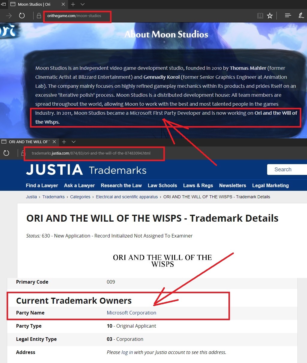 Moon studios was created as independent in 2010. In 2011 join MS as first party developer. All trademarks to both part of ORI of course belongs to MS. Next time use Google to check who own trademark and studio.