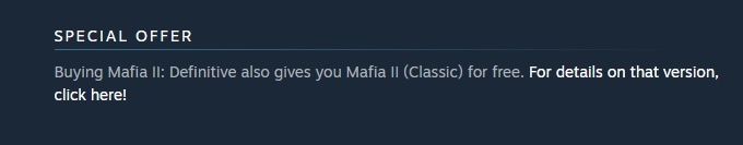 fyi mafia 2 classic is free with mafia ii definitive ed purchase & mafia II definitive ed is free if you won base games 2 & 3 https://uploads.disquscdn.com/images/36f55ae778f252f50037888964a18c919f354409a83d1b82738dda9a4a4c12e9.jpg
