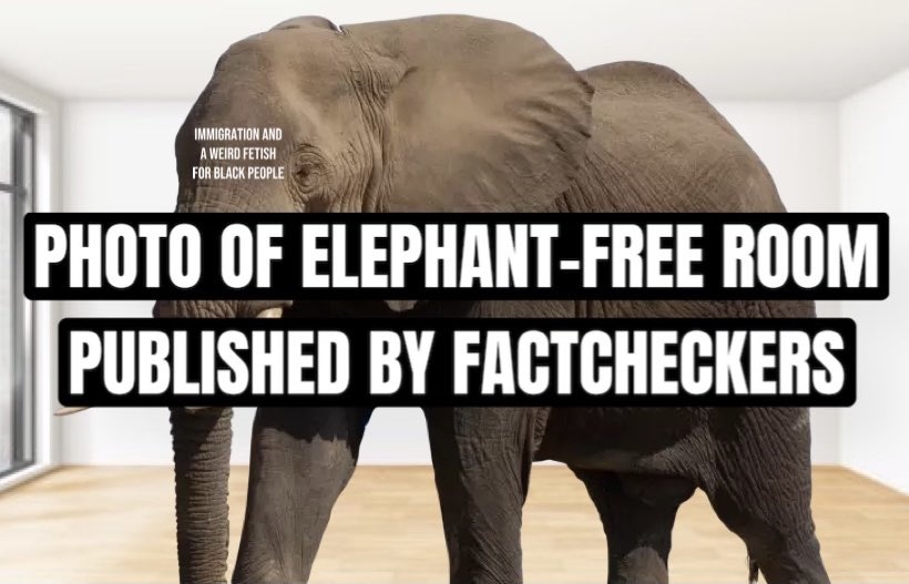 “As problems continue to mount across the Country, Far Right Extremists have claimed that there is, in fact, an Elephant in the Room. But Official Fact Checkers inspected The Room and found no evidence of any Elephants”