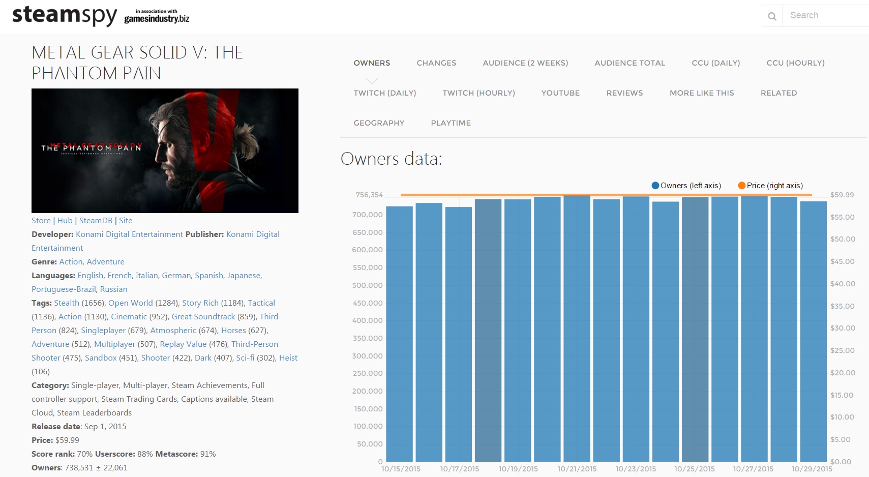 Konami’s latest financial results revealed that Metal Gear Solid V: The Phantom Pain has shipped 5 million units (including downloads) since its launch. The game was released on five different platforms (PC, PS4, Xbox One, PS3 and X360) and according to Steamspy’s stats, the game sold around 750K copies on the PC.