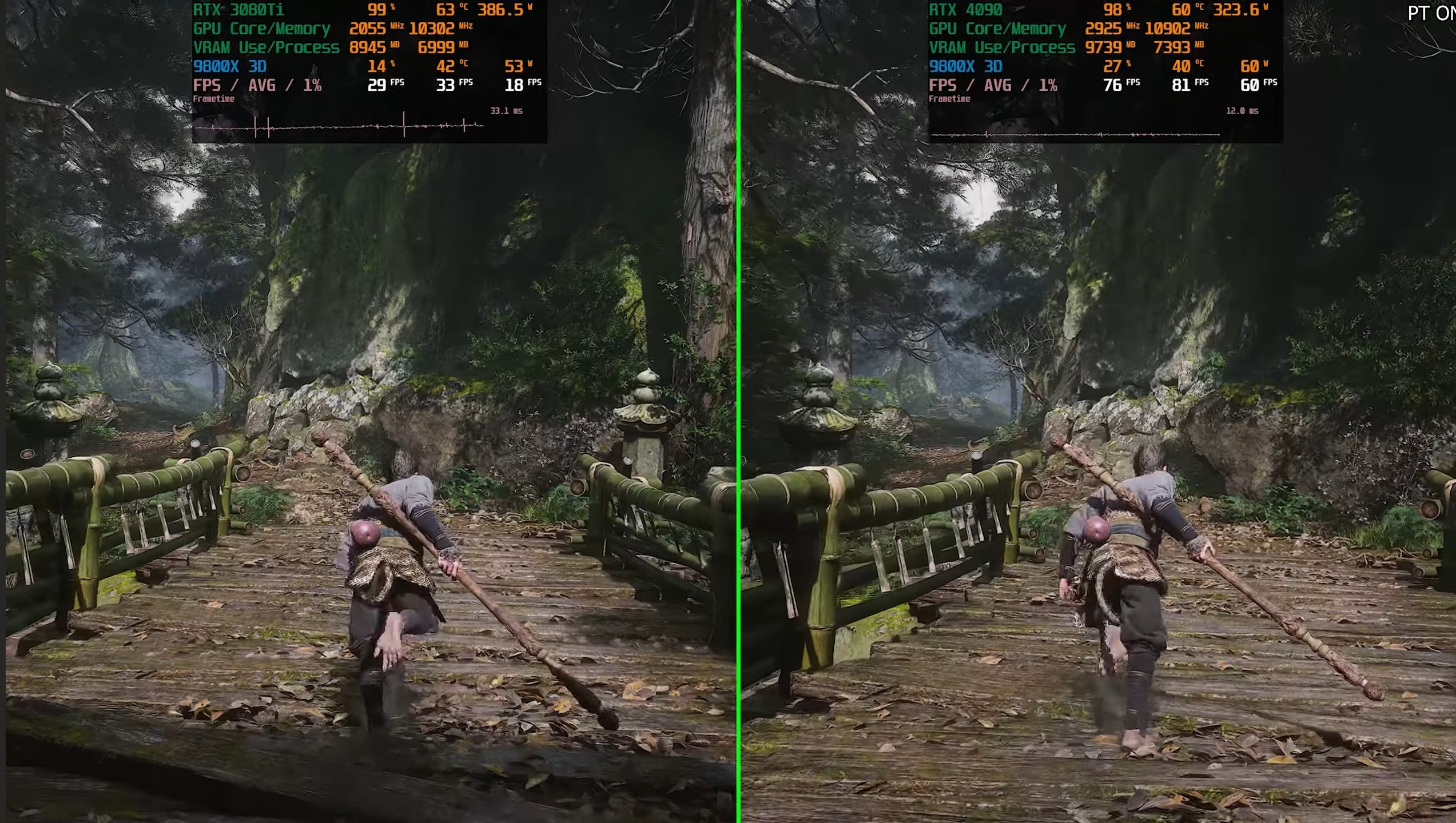 Black Myth Wukong runs much better on the RTX40 series. The game is still very demanding, but it's possible to get playable results with some tweaks. I get around 110-120fps at 1440p DLSSQ + FGx2 with very high RT and 130-150fps with medium PT.